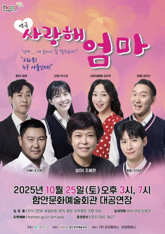 [경남도민뉴스=권중환 기자] 함안군은 코미디언 조혜련이 연출과 주연을 맡은 연극 '사랑해 엄마'를 오는 10월 25일 토요일 오후 3시와 7시, 2회에 걸쳐 함안문화예술회관 대공연장에서 공연한다고 밝혔다.