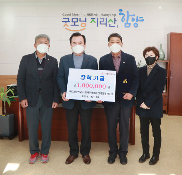 [경남도민뉴스] 연말을 맞이하여 함양군 지역인재들을 위한 기탁금 행렬이 이어지고 있는 가운데 13일 바르게살기운동 함양군협의회 장도현 산악회장이 인재육성장학금 100만원을 전달했다.