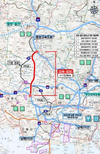 김해~밀양 고속도로는 김해시 진례면에서 밀양시 상남면을 연결하는 총연장 19.8km, 왕복 4차로 규모의 신설 고속도로로, 총사업비 약 1조 4,965억 원이 투입될 예정이다.