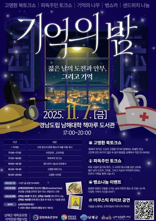 [경남도민뉴스=김부경 기자] ‘젊은 날의 도전과 안부, 그리고 기억’이라는 주제로 독일마을 기억의 밤 행사가 오는 11월 7일 17시부터 경남도립남해대학 책마루도서관에서 열린다.