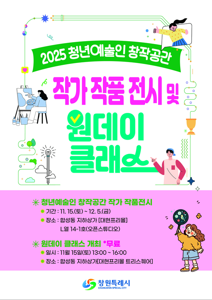 [경남도민뉴스=박민호 기자] 창원특례시는 오는 11월 15일 합성동 지하상가(대현프리몰)에서 청년예술인 창작공간 입주 작가들의 성과 공유를 위한 작품 전시회와 시민과 함께 창작의 즐거움을 나누는 원데이클래스를 개최한다고 밝혔다.