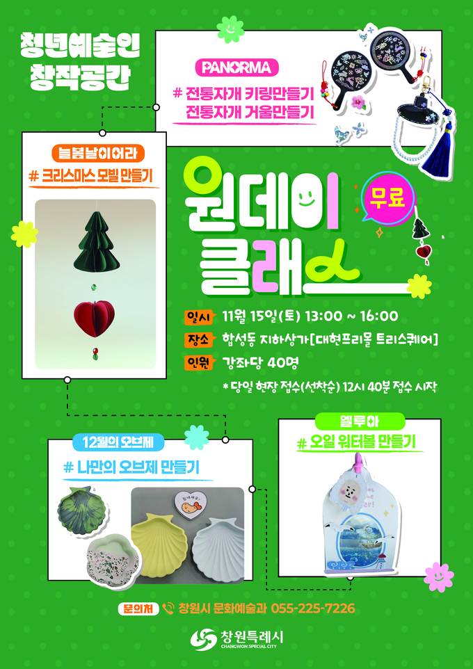 원데이클래는 합성동 지하상가에서 무료로 운영되며, 행사 당일 선착순 현장 접수를 통해 참여할 수 있다.