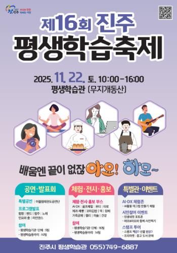 이번 축제는 ‘배움엔 끝이 없잖아요! 평생학습도시 하모~ 진주!’를 주제로, 45여 개 평생학습 기관·단체·동아리가 참여해 한 해의 학습성과를 공유하고 평생학습의 즐거움과 동기를 높이는 다양한 체험·전시·공연 프로그램을 선보일 예정이다.