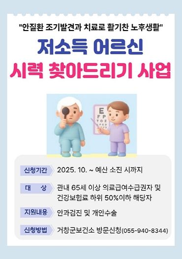 지원대상은 거창군에 거주하는 의료급여수급권자와 건강보험료 기준(직장가입자 127,500원 이하, 지역가입자 57,000원)에 해당하는 65세 이상 노인이다. 군은 안과검진과 개안수술을 지원함으로써 경제적 부담을 덜어드리는 동시에, 시력 저하로 인한 일상 속 불편을 해소하고, 삶의 질 향상과 사회적 고립 예방에도 힘쓰고 있다.