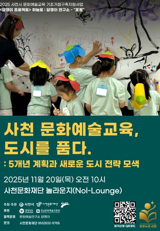 [경남도민뉴스=변정형 기자] 사천문화재단이 오는 11월 20일 오전 10시, 사천문화재단 놀라운지에서 “사천 문화예술교육, 도시를 품다 : 5개년 계획과 새로운 도시 전략 모색”을 주제로 한 포럼을 통해 문화예술교육을 도시 발전의 핵심 동력으로 삼기 위한 중장기 전략을 공개한다.
