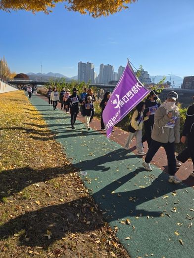 행사는 개회 인사를 시작으로 몸풀기 플래시몹과 준비운동에 이어 걷기대회 출발 순으로 진행됐다. 참가자들은 거창스포츠파크를 출발해 반환점인 원상동 숲까지 왕복 약 8km 구간을 걸으며 ‘성평등 구호’를 함께 외쳤고, 반환점에서는 간식과 음료를 나누며 즐거운 시간을 보냈다.