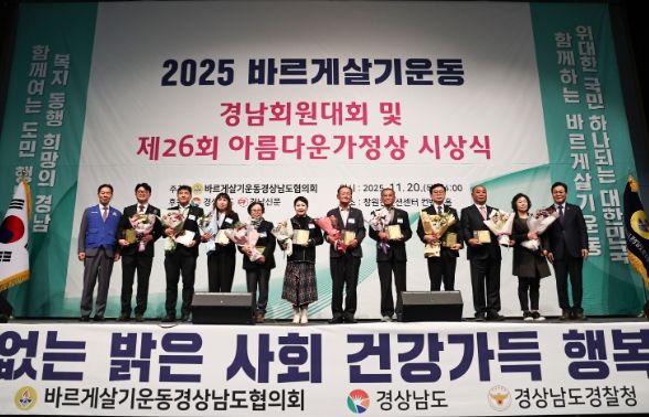 [경남도민뉴스=구인애 기자] 경상남도가 20일 창원컨벤션센터에서 열린 ‘2025 바르게살기운동 경남 회원대회 및 제26회 아름다운 가정상 시상식’에서 지역사회 봉사에 앞장서 온 회원들을 격려했다.