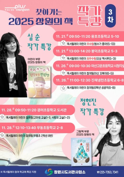 [경남도민뉴스=박민호 기자] 창원특례시 도서관사업소는 11월 21일부터 28일까지 ‘찾아가는 2025 창원의 책 작가 특강’을 운영한다.