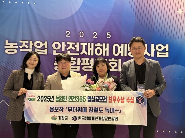 [경남도민뉴스=백형찬 기자] 거창군은 지난 20일 농촌진흥청이 주최한 ‘2025년 농작업 안전재해 예방사업’ 종합 평가회에서 안전 365 캠페인 영상공모전에 한국생활개선거창군연합회(회장 윤진미)와 관의 협력으로 만든 영상이 최우수상을 수상했다고 밝혔다.