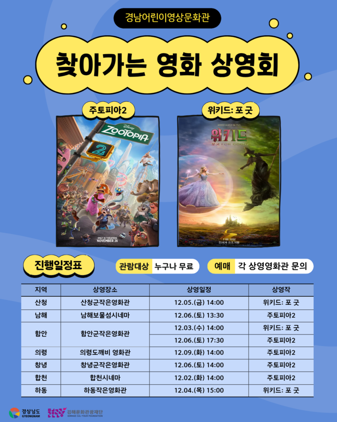 이번 찾아가는 영화상영회는 산청, 남해, 함안, 의령, 창녕, 합천, 하동의 작은 영화관과 협력하여 지역 주민들에게 영화를 선보이는 특별한 행사로 어린이와 가족들이 함께 즐길 수 있는 영화 ‘주토피아2’와 ‘위키드: 포 굿’을 무료로 상영한다.