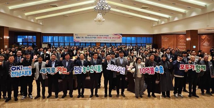 [경남도민뉴스=최인태 기자] 전라남도는 28일 남악 스카이웨딩컨벤션에서 농수산 수출기업, 수출 유관기관 등 200여 명이 참석한 가운데 ‘2025 농수산식품 수출기업 전진대회’를 열어 2026년 수출 10억 달러 달성 결의를 다졌다.