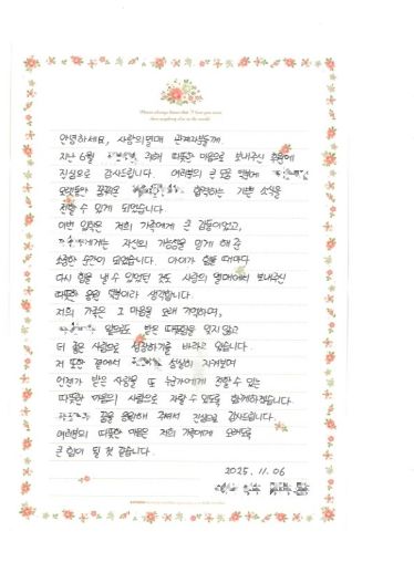 감사의 편지를 보낸 이는 지난 5월 1일 지역 언론사를 통해 사연을 공개한 희정씨! 희정 씨는 관내 한 저소득 가정의 어머니로, 평소 경제적 어려움으로 자녀 교육비 마련에 큰 부담을 겪어 왔다. 그러나 동구가 사랑의 열매와 함께 추진한 '사랑의 징검다리' 후원금 모금 지원사업을 통해 교육비 부담이 덜어지면서,