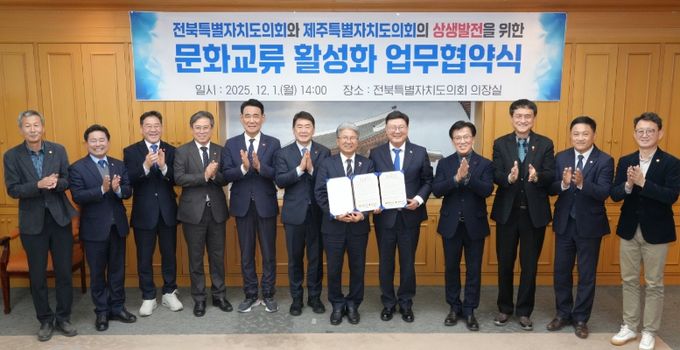 [경남도민뉴스=최인태 기자] 전북특별자치도의회와 제주특별자치도의회는 문화·관광·세계유산 분야 협력을 강화하기 위해 1일 전북도의회 의장실에서 문화교류 활성화 업무협약(MOU)을 체결했다.