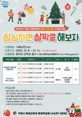 [경남도민뉴스=김부경 기자] 거제시는 오는 12월 8일부터 11일까지 ‘심쿵해(심심하면 살짝쿵 해보자)’ 평생학습 프로그램 수강생을 선착순으로 모집한다고 밝혔다.