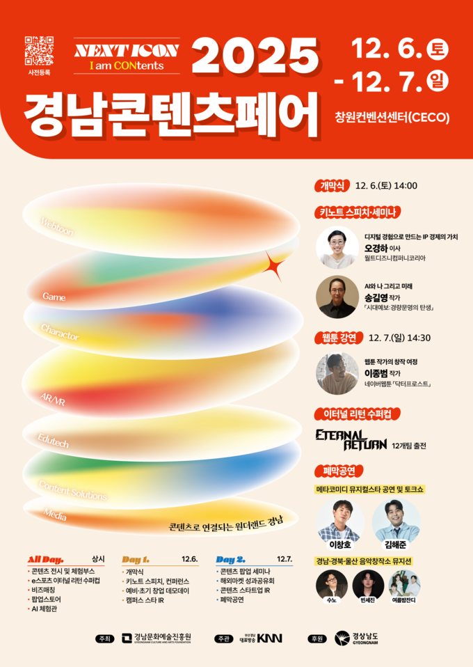 [경남도민뉴스=구인애 기자] 경상남도는 오는 6~7일 양일간 창원컨벤션센터에서‘ 콘텐츠로 연결되는 원더랜드, Next ICON 경남’을 주제로 ‘2025 경남콘텐츠페어’를 개최한다고 밝혔다.