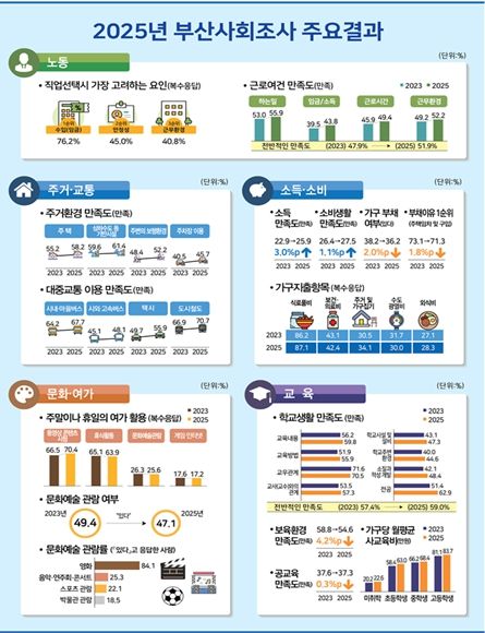 [노동] 현재 하고 있는 일(직장)의 근로 여건에 대한 전반적인 만족도는 51.9퍼센트(%)로 2023년 대비 4.0퍼센트포인트(%P) 증가했으며, 부산시(구·군)가 고용 확대를 위해 우선적으로 지원해야 할 주요 시책으로 ▲‘일자리 확대’(47.1%) ▲‘기업유치 및 고용촉진’(24.9%) 순으로 나타났다.