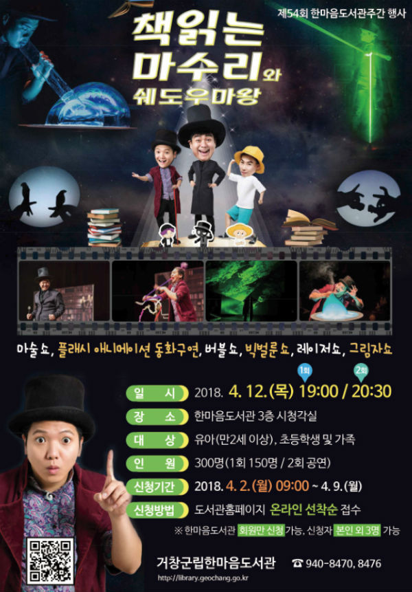 참가신청은 도서관홈페이지(library.geochang.go.kr)를 통해 오는 4월 2일부터 4월 9일까지 할 수 있으며 선착순 모집이다. 회당 150명씩 2회 공연으로(저녁 7시, 8시 30분) 무료로 공연 관람을 할 수 있다.