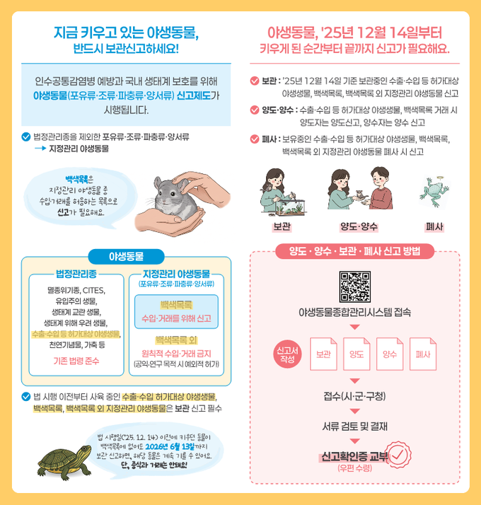 한편, 법 시행 이전부터 키우던 백색목록 외 지정관리 야생동물은 오는 2026년 6월 13일까지 신고하면 기를 수 있는데 증식과 거래는 허용하지 않는다.