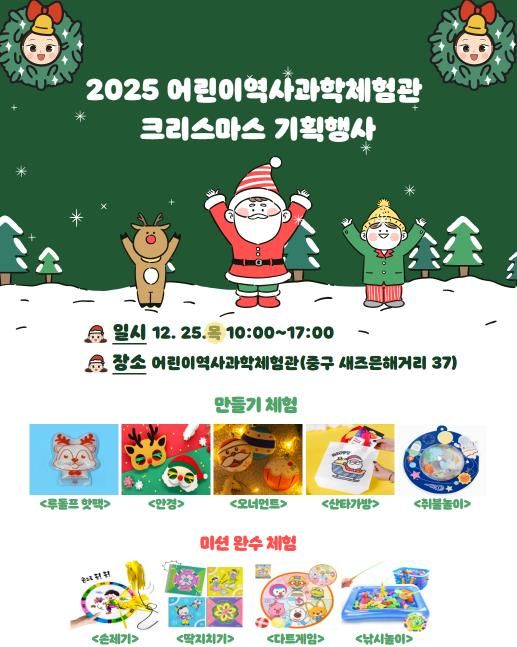 [경남도민뉴스=최재경 기자] 울산 중구에서 운영하는 울산 중구어린이역사과학체험관이 오는 12월 25일 아이들을 위한 ‘2025년 크리스마스 기획행사’를 개최한다.