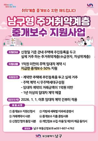 [경남도민뉴스=신석주 기자] 부산 남구는 관내 거주하는 주거 취약계층의 경제적 부담을 완화하고 안정적인 주거환경을 조성을 위해 오는 2026년 1월부터 ‘주거 취약계층 중개보수 지원사업’을 시행한다고 밝혔다.