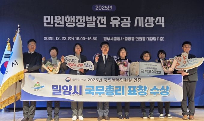 [경남도민뉴스=나희준 기자] 밀양시는 23일 정부세종청사에서 열린 ‘2025년 민원행정발전 유공 시상식’에서 국민행복민원실 우수기관으로 선정돼 국무총리 표창을 수상했다.