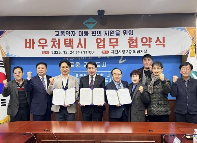 [경남도민뉴스=박만수 기자] 제천시는 지난 24일 교통약자의 이동권 보장과 이동 편의 증진을 위해 청풍호콜센터, ㈜티머니 모빌리티와 바우처택시 업무협약을 체결했다.
