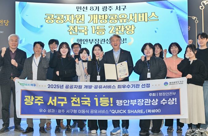 [경남도민뉴스=최현인 기자] 광주광역시 서구의 생활밀착형 공유정책 ‘천원 피크닉’이 전국 무대에서 주목받았다. 서구는 행정안전부가 주관한 ‘2025년 공공자원 개방·공유서비스 실적평가’에서 전국 최우수 기관으로 선정돼 행정안전부 장관상을 수상했다고 29일 밝혔다.