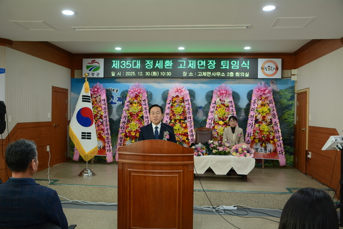 정세환 면장은 퇴임사를 통해 “고제면에서 근무한 기간 하루하루가 모두 뜻깊은 시간이었다”며 “항상 협조해 주신 면민과 지역 단체장 여러분께 진심으로 감사드린다”고 말했다. 이어 “35년간의 공직생활을 마무리하지만, 앞으로도 한 사람의 거창군민으로서 지역 발전을 위해 힘을 보태겠다”고 소회를 밝혔다.