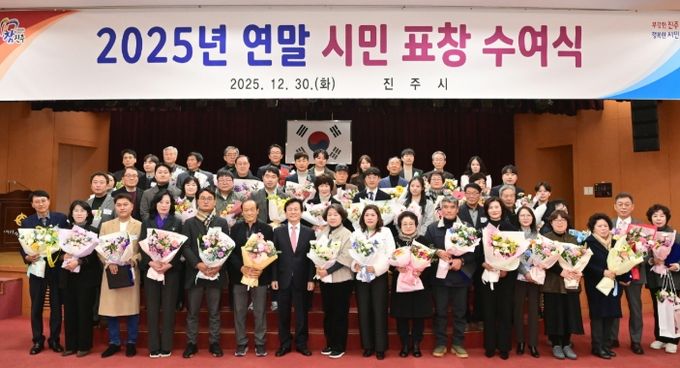 [경남도민뉴스=권중환 기자] 진주시는 30일 시청 시민홀에서 지역사회 발전과 선행 활동을 몸소 실천하며 공동체의 귀감이 된 시민 98명을 대상으로 ‘2025년 연말 시민 표창 수여식’을 개최했다.