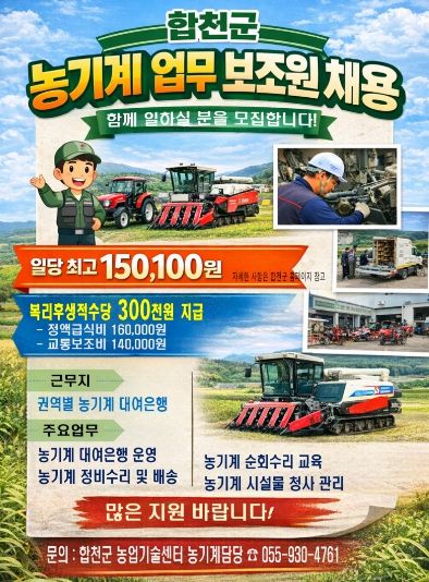 [경남도민뉴스=김춘호 기자] 합천군은 농기계대여은행 운영체계를 강화하고 농업인 영농 편의를 높이기 위해 2026년 농기계 업무보조원 기간제근로자 9명을 채용한다고 14일 밝혔다.