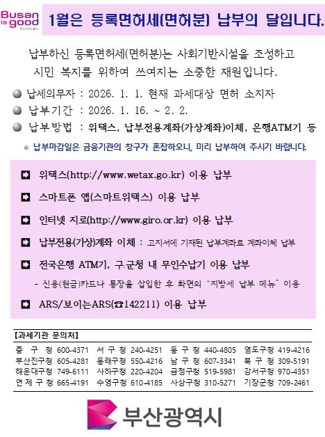 [경남도민뉴스=신석주 기자] 부산시는 2026년 정기분 등록면허세(면허분) 총 43만여 건, 142억 원을 부과했다고 밝혔다.