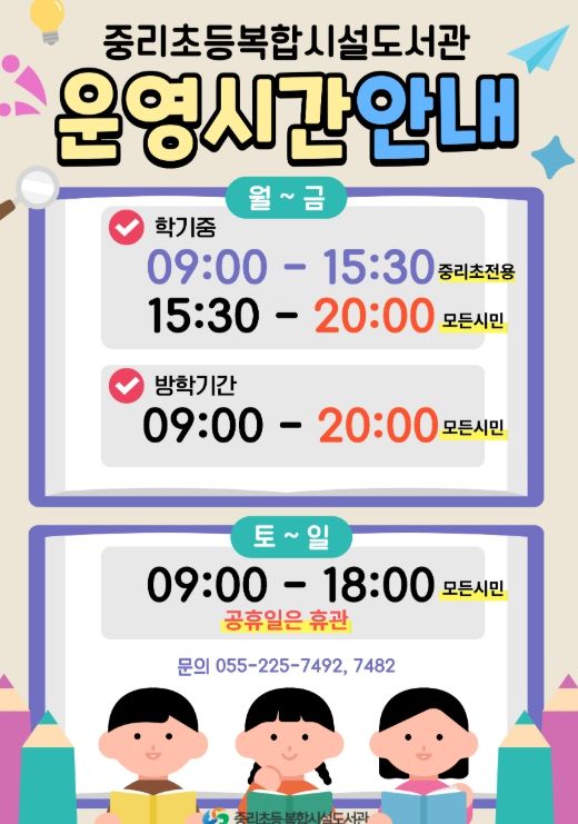 [경남도민뉴스=박민호 기자] 창원특례시 중리초등복합시설도서관은 내서도서관 재건립 장기 휴관으로 인한 불편을 해소하고, 시민들의 도서관 이용 편의를 높이기 위해 2026년 1월 2일부터 평일 저녁 8시까지 도서관 야간 운영을 진행하고 있다고 밝혔다.