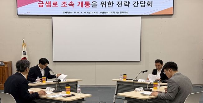 [경남도민뉴스=신석주 기자] 부산광역시의회 이준호.이종진 의원은 1월 19일 오후 1시, 시의회 중회의실에서 '금샘로 조속 개통을 위한 전략 간담회'를 개최했다. 이번 간담회는 산성터널 접속도로 미개설 구간인 금샘로 공사의 지연 원인을 점검하고, 조속한 사업 추진을 위한 실질적인 해결 방안을 모색하기 위해 마련됐다.