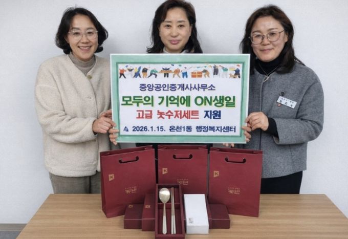 [경남도민뉴스=신석주 기자] 부산 동래구 온천1동 행정복지센터는 지난 15일 한국공인중개사협회 동래구지회 소속 중앙공인중개사사무소(대표 박유현)로부터 온천1동 특화사업인 '모두의 기억에 온(ON) 생일' 사업 추진을 위해 고급 놋수저 12세트를 후원받았다고 밝혔다.