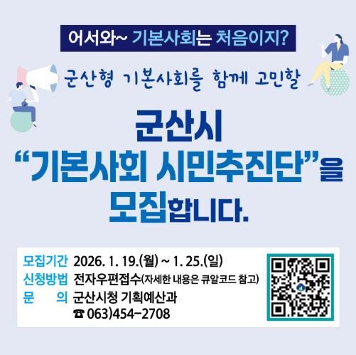 [경남도민뉴스=최인태 기자] 군산시가 오는 25일까지 ‘기본사회’ 밑그림을 함께 그려 나갈 ‘군산시 기본사회 시민추진단’을 공개 모집한다.