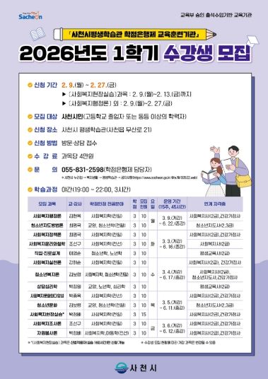 [경남도민뉴스=변정형 기자] 사천시평생학습관 학점은행제 교육훈련기관은 2026년도 1학기 평가인정 학습과정 수강생을 2월 9일부터 27일까지 모집한다.