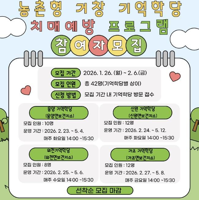[경남도민뉴스=백형찬 기자] 거창군 치매안심센터는 지역 주민의 인지건강 증진과 치매 예방을 위해 상반기 농촌형 거창 기억학당 치매예방 프로그램 참여자를 모집한다고 22일 밝혔다.