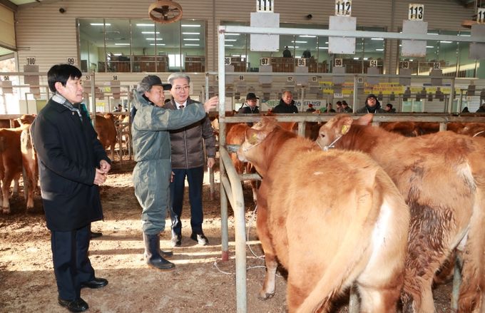 [경남도민뉴스=이상민 기자] 의령군은 지난 26일 이른 아침 의령축협이 운영하는 가축시장을 방문해 한우 거래가격 동향과 송아지 경매 상황을 점검하고, 한우 사육 농가의 애로사항을 청취했다.