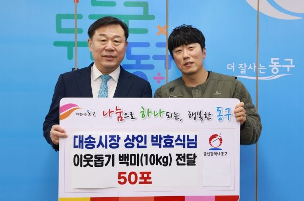 [경남도민뉴스=최재경 기자] 울산 동구 대송시장에서 식품유통업체를 운영하고 있는 new캐슬장터 박효식 대표가 1월 28일 오전 11시 10분 동구청을 방문해 시가 200만원 상당의 쌀(10kg) 50포를 전달했다.