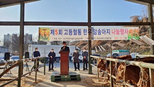 [경남도민뉴스] 함양군은 17일 오전 함양가축시장에서 소규모 한우 사육농가 우량 한우 개량을 위한 ‘고등혈통 우량 한우 나눔 행사’를 실시하였다.