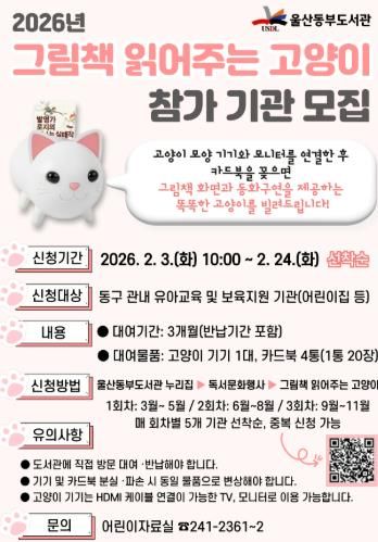 [경남도민뉴스=최재경 기자] 울산동부도서관은 2월 3일부터 24일까지 동구 어린이집과 유치원, 보육 기관 등을 대상으로 ‘그림책 읽어주는 고양이’ 프로그램 참가 기관을 모집한다.