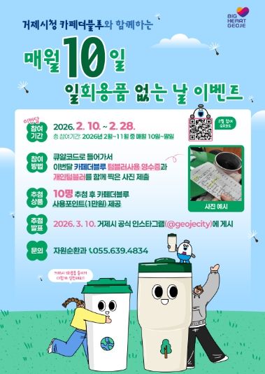 해당 이벤트는 거제시청 내 카페더블루에서 텀블러로 음료를 주문하고 해당 영수증과 텀블러를 같이 찍은 사진을 큐알코드로 제출하면 매월 10일 마다 10명을 추첨하여 카페더블루 사용포인트 1만원을 제공한다는 내용이다.