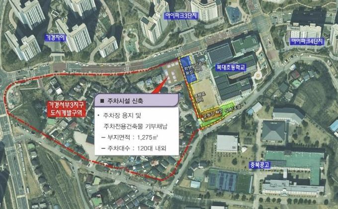 이범석 청주시장은 이 같은 문제를 해소하기 위해 특단의 조치방안 마련을 지시했고, 시 도시개발과는 가경서부3지구 사업 시행사와 지속적인 협의를 통해 가경동 2282 일원 부지면적 1,275㎡에 120대 내외 차량 주차가 가능한 주차전용 건축물을 공공기여 방식으로 조성하는 내용을 실시계획에 반영했다.