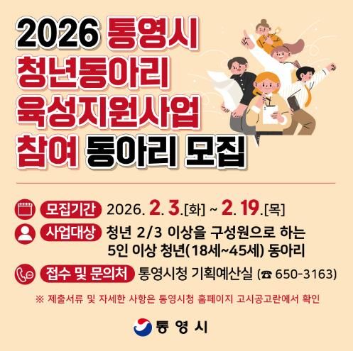 [경남도민뉴스=김부경 기자] 통영시는 청년들의 자발적인 사회 참여와 활발한 활동을 촉진하기 위해 2026년 청년동아리 육성지원 사업을 시행한다고 3일 밝혔다.