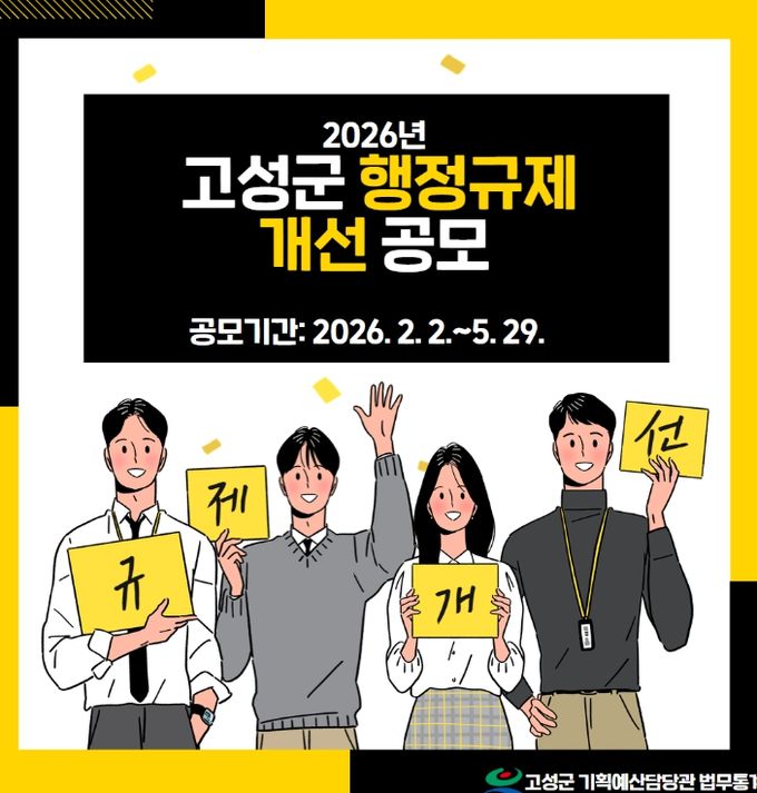 [경남도민뉴스=김태수 기자] 고성군은 군민 생활 및 경제활동에 걸림돌이 되는 불합리한 규제를 발굴·개선하기 위해'2026년 고성군 행정규제개선 공모'를 2월 2일부터 5월 29일까지 실시한다.