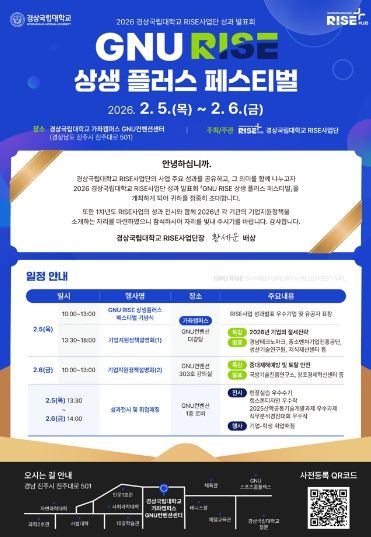 [경남도민뉴스=구인애 기자] 경상국립대학교 라이즈(RISE) 사업단(단장 황세운)은 2월 5~6일 가좌캠퍼스 GNU 컨벤션센터 대강당 일원에서 RISE사업의 1차 연도 성과발표회 및 기업지원정책 설명회 ‘GNU RISE 상생 플러스 페스티벌’을 개최한다.