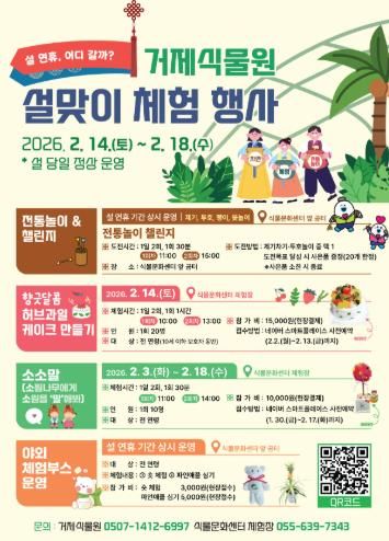 이번 행사는 2월 14일부터 2월 18일까지 거제식물원 일원에서 진행되며, 전통놀이와 체험 프로그램, 원데이클래스를 통해 전 세대가 함께 참여하며 즐길 수 있는 명절 체험의 장으로 마련됐다.