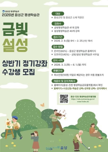 [경남도민뉴스=박만수 기자] 음성군 평생학습관(금빛·설성)에서 2026년 상반기 정기강좌 수강생을 모집한다.