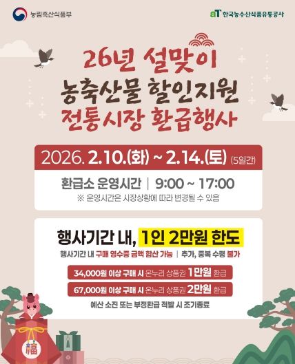 이번 행사는 농림축산식품부가 지원하는 2026년 설맞이 전통시장 소비 촉진 캠페인의 일환으로, 시민이 전통시장에서 국산 농축산물을 구매할 경우 구매 금액의 일부를 온누리상품권으로 환급해주는 방식이다.