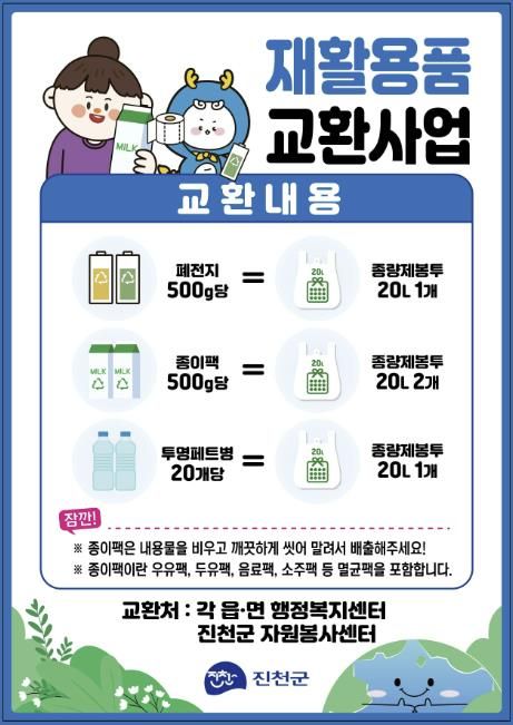 [경남도민뉴스=박만수 기자] 충북 진천군은 일상 속 자원순환 문화를 확산하고 재활용 실천을 독려하기 위해 현재 시행 중인 ‘재활용품 교환사업’을 올해 더욱 확대 운영한다고 9일 밝혔다.